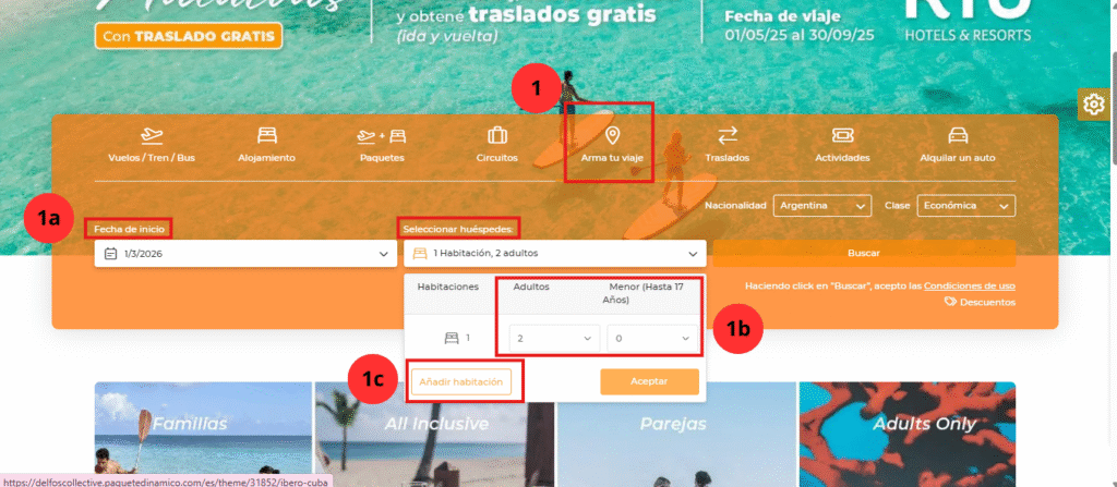 - Entrá al motor “Arma tu viaje” y elegí la fecha, cantidad de pasajeros y cantidad de habitaciones.