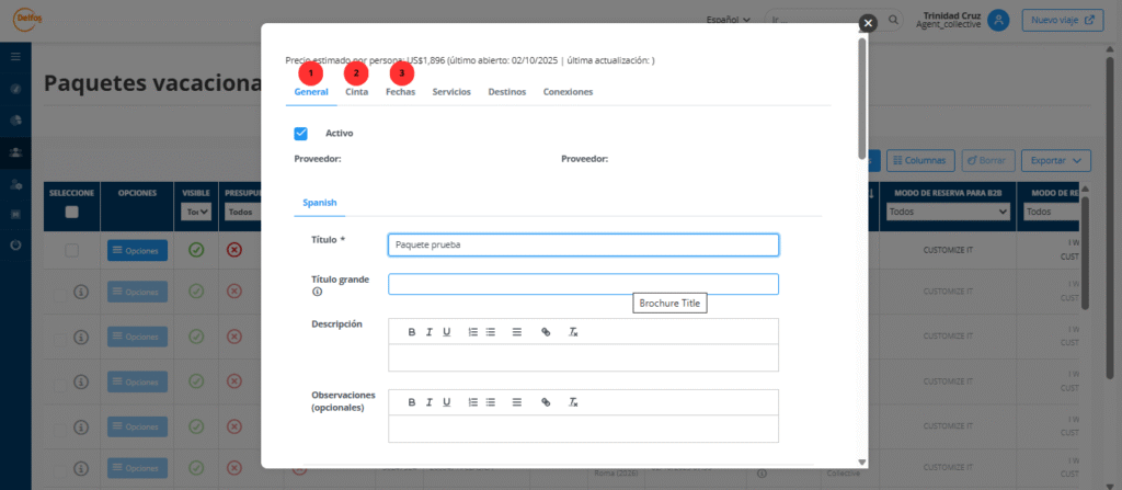 - Fechas: Definir fechas de publicación: Desde cuándo y hasta cuándo el paquete estará visible en la web, o incluso programar un paro de ventas en caso de necesidad.