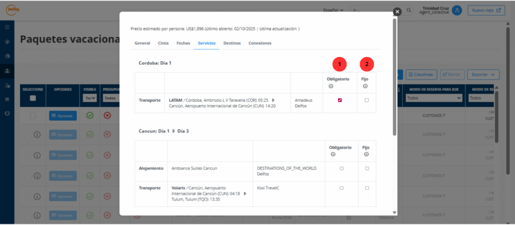 - Mandatory (Obligatorio): el paquete exige siempre ese servicio, aunque el sistema elija la variante disponible (ej: siempre debe haber un hotel, aunque varíe el proveedor).