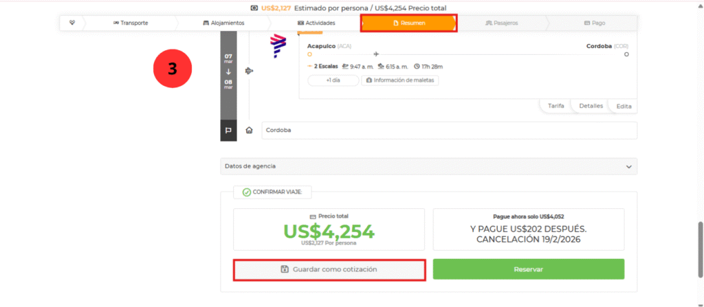 - Una vez ya seleccionados los servicios que deseen agregar a su paquete (Aéreos, hotel, actividades, traslados, etc.) En lugar de reservar, elegí “Guardar como cotización”.