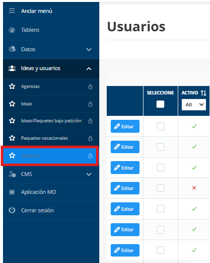 En esta sección vas a ver los usuarios vinculados a tu Marca Blanca, tanto los que usan tu web como agentes de ventas de tu agencia o tus clientes que navegan.