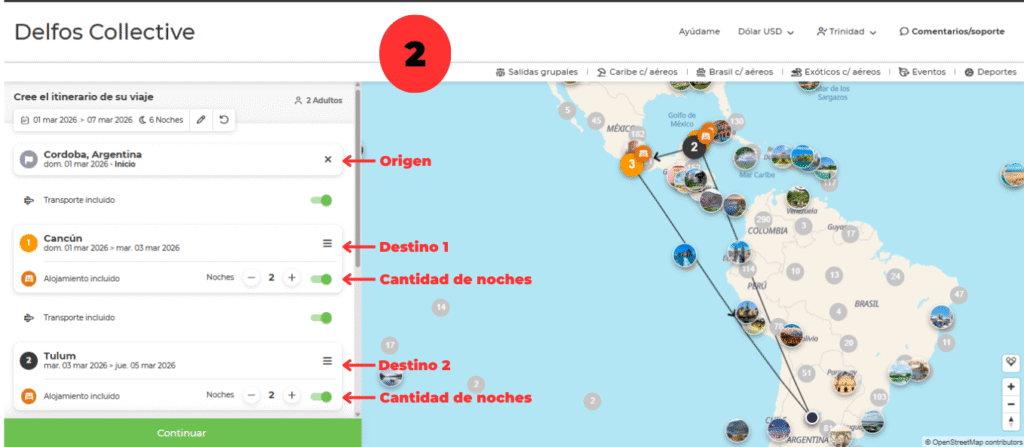 - Elegí el itinerario de tu paquete, el origen y los destinos y la cantidad de noches que tu pasajero pasará en cada destino.
